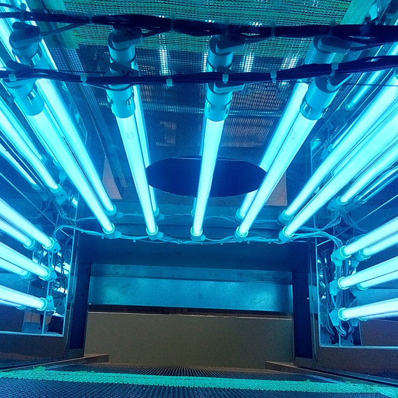 5、各組殺菌燈可單獨(dú)控制, 增加可調(diào)整 UV 燈管角度的調(diào)節(jié)裝置, 燈管總長(zhǎng)589mm, 波長(zhǎng)為 254.7mm, 殺菌率可以達(dá)到 95%)。裝有自動(dòng)計(jì)時(shí)器, 可隨時(shí)監(jiān)控?zé)艄艿氖褂脮r(shí)間, 方便燈管的更換。如產(chǎn)品為可掉渣類, 可采用托盤放在輸送帶上殺菌。